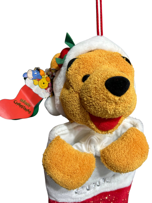 London Disney Store - Winnie the Pooh 2002 3D soft Plush Christmas Snowflake Stocking Santa Hat - Vintage - 22"