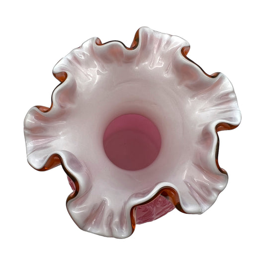Fenton Art Glass - Wild Rose & Bowknot Coral Overlay Ruffled/Crimped Edge Vase - Vintage 1960's - 7.5"