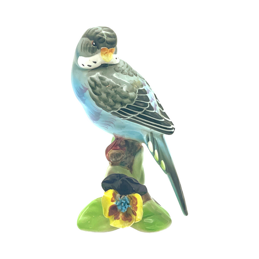 Lefton China - Parakeet On Tree Stump With Flowers - Glossy - 5.5"