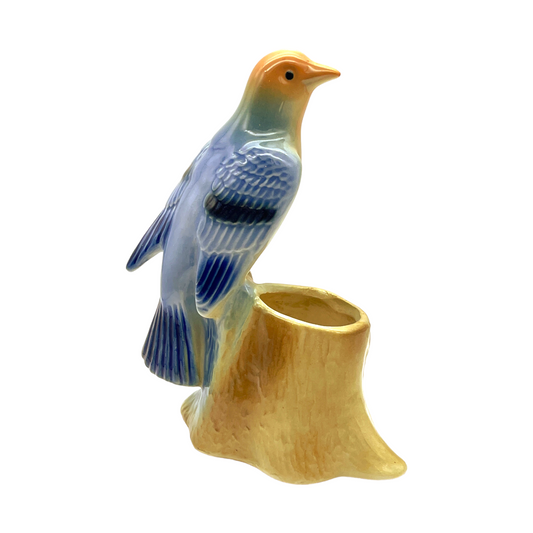 Royal Copley - Blue Tanager On Brown Tree Stump Planter - Vintage - 6.25"
