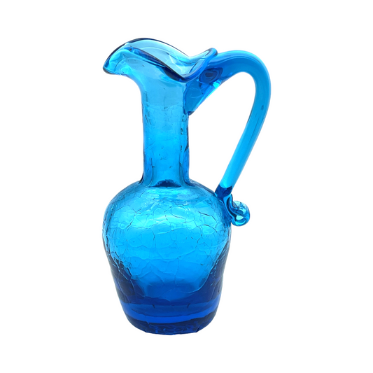 Vintage Blue Crackle Glass Art Pitcher and Bud Vase Set