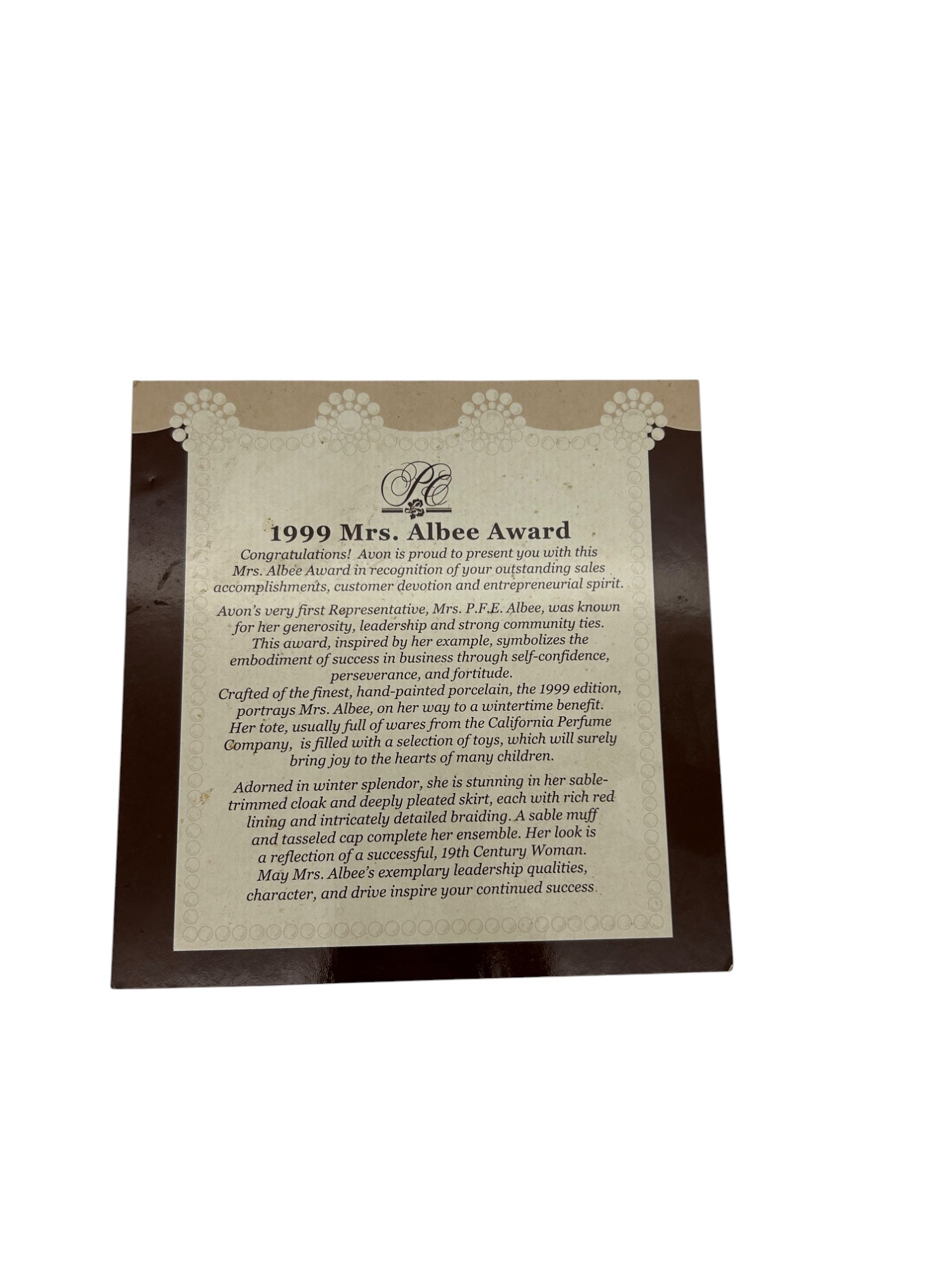 Avon - 1999 Presidents Club Figure Mrs. Albee Award Figurine Statue - NWB - 10"