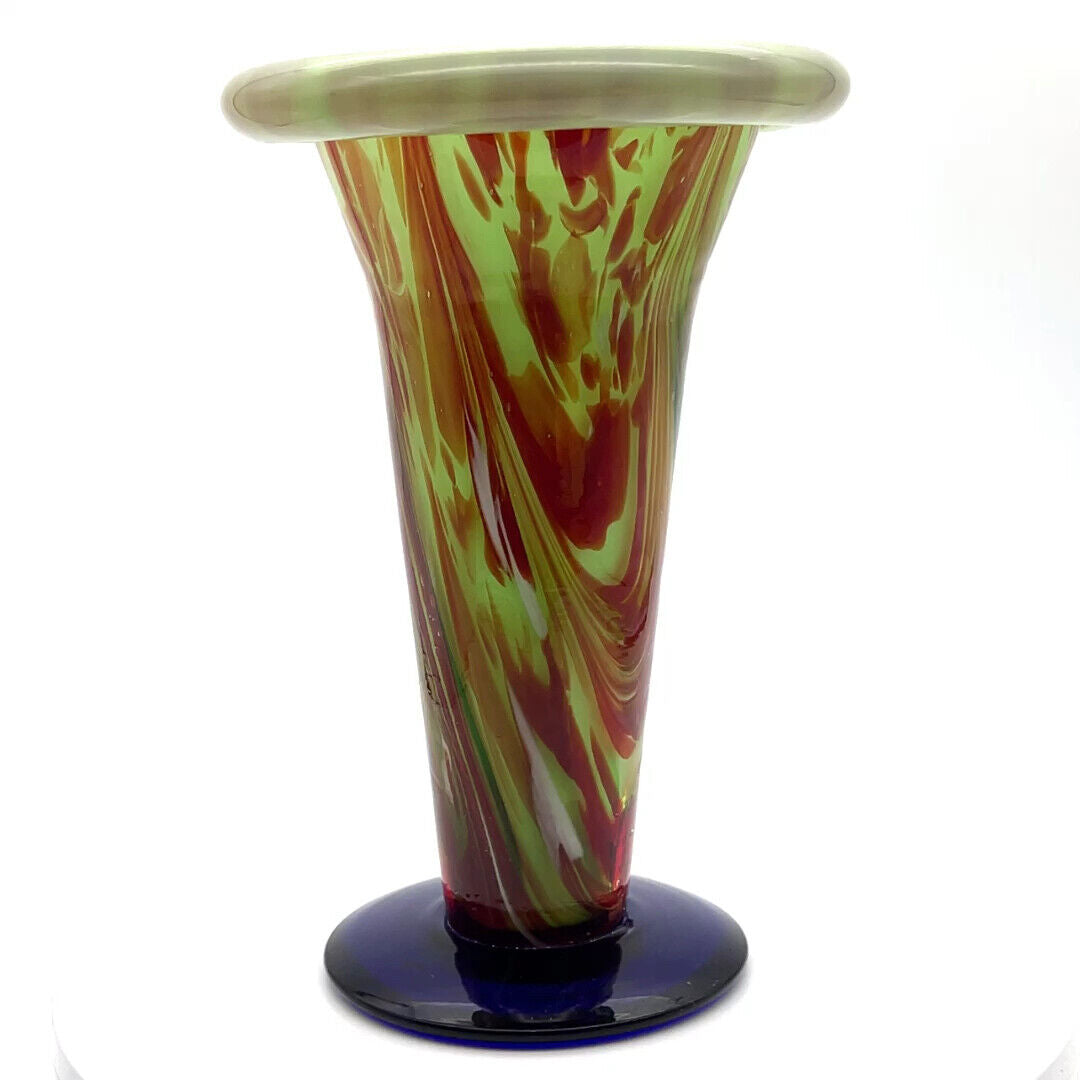 Artisanal Fusion - Handblown Glass Vase - Green & Amber with Cobalt Base - 9"