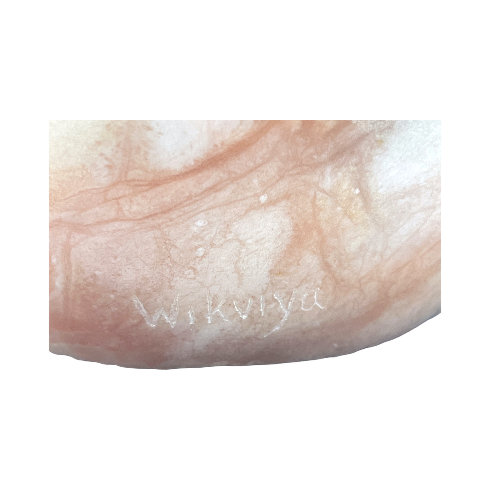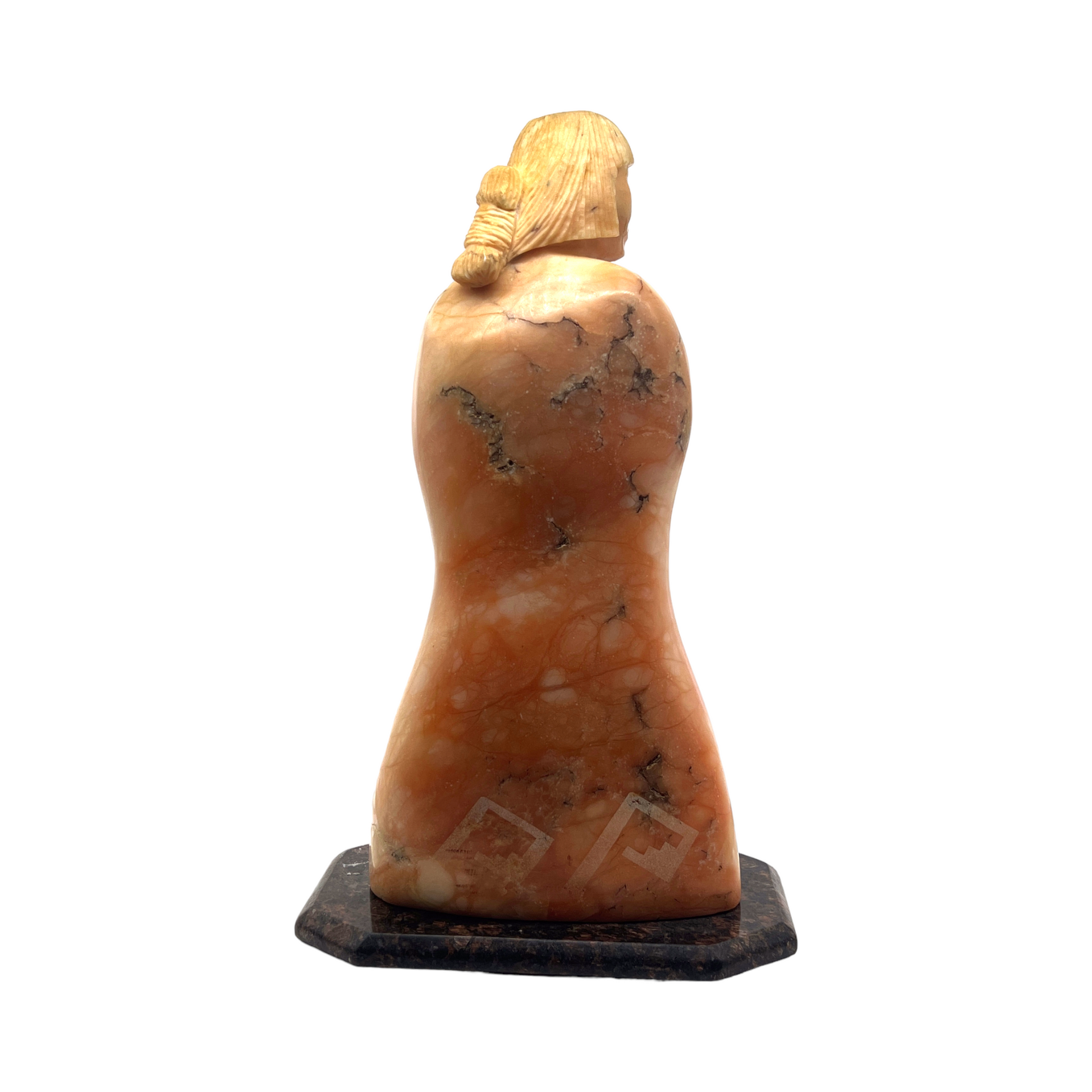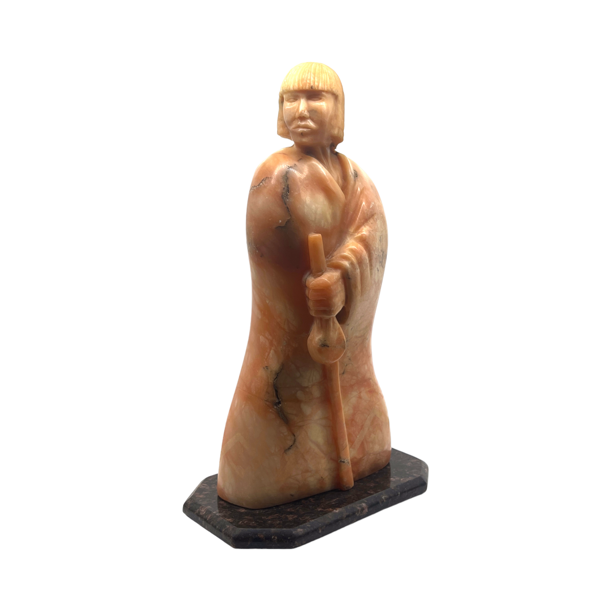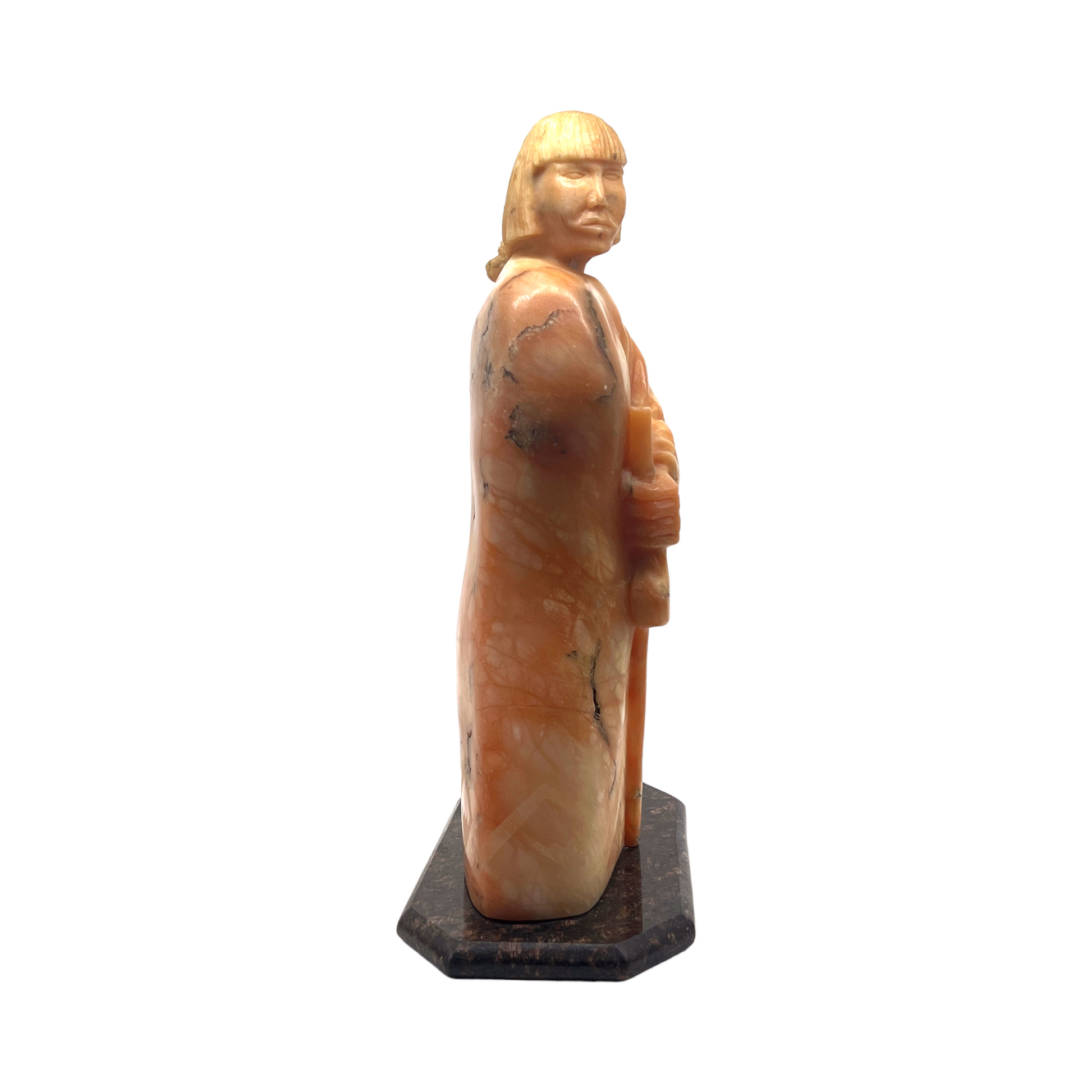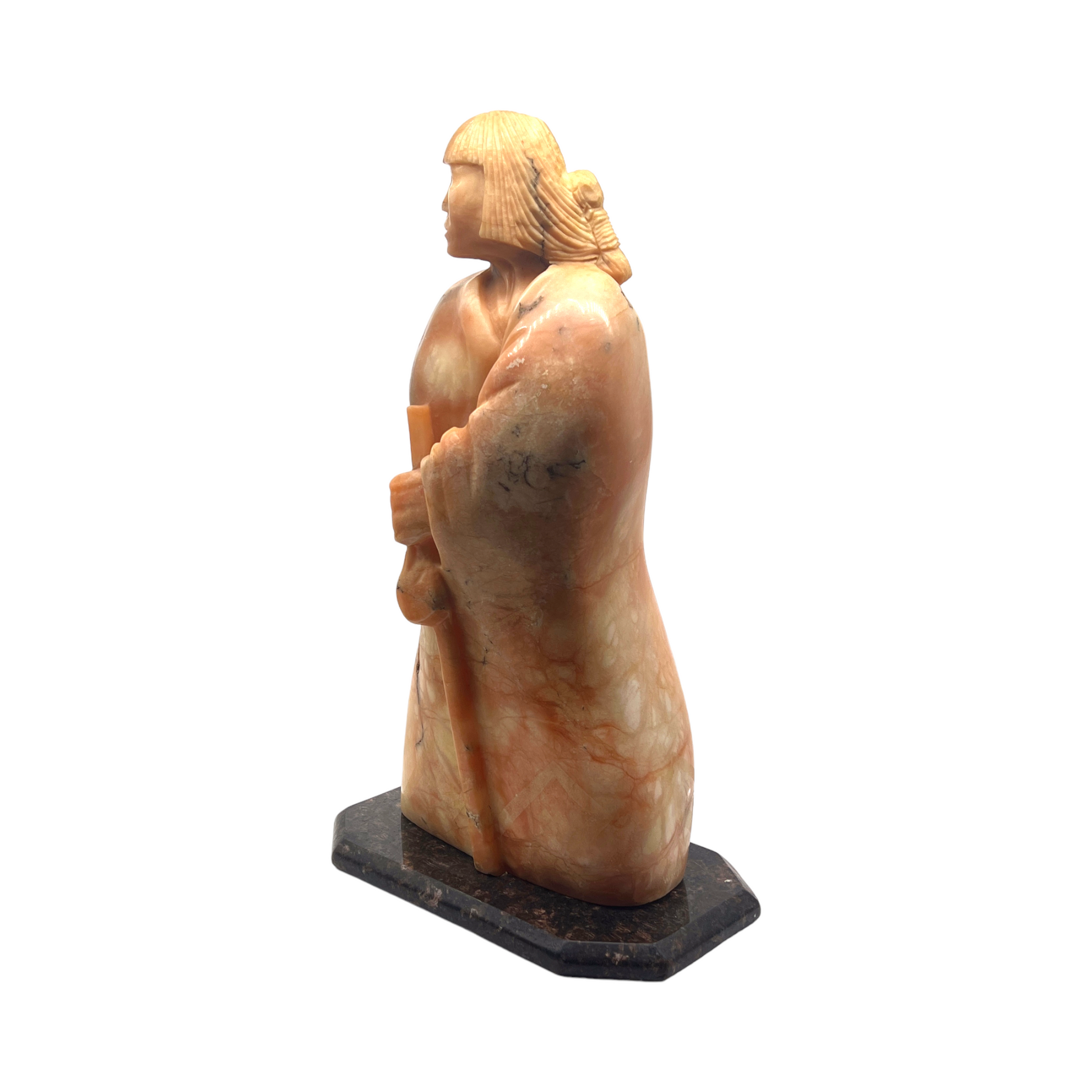 This is a Late Twentieth Century (or after) stone sculpture by the Hopi native American artist Steve Wikviya LaRance depicting a robed Hopi elder or shaman carrying a staff. It is signed "Wikviya" and inscribed near the bottom of the work, perhaps made of alabaster or similar material. The sculpture is mounted on a base.