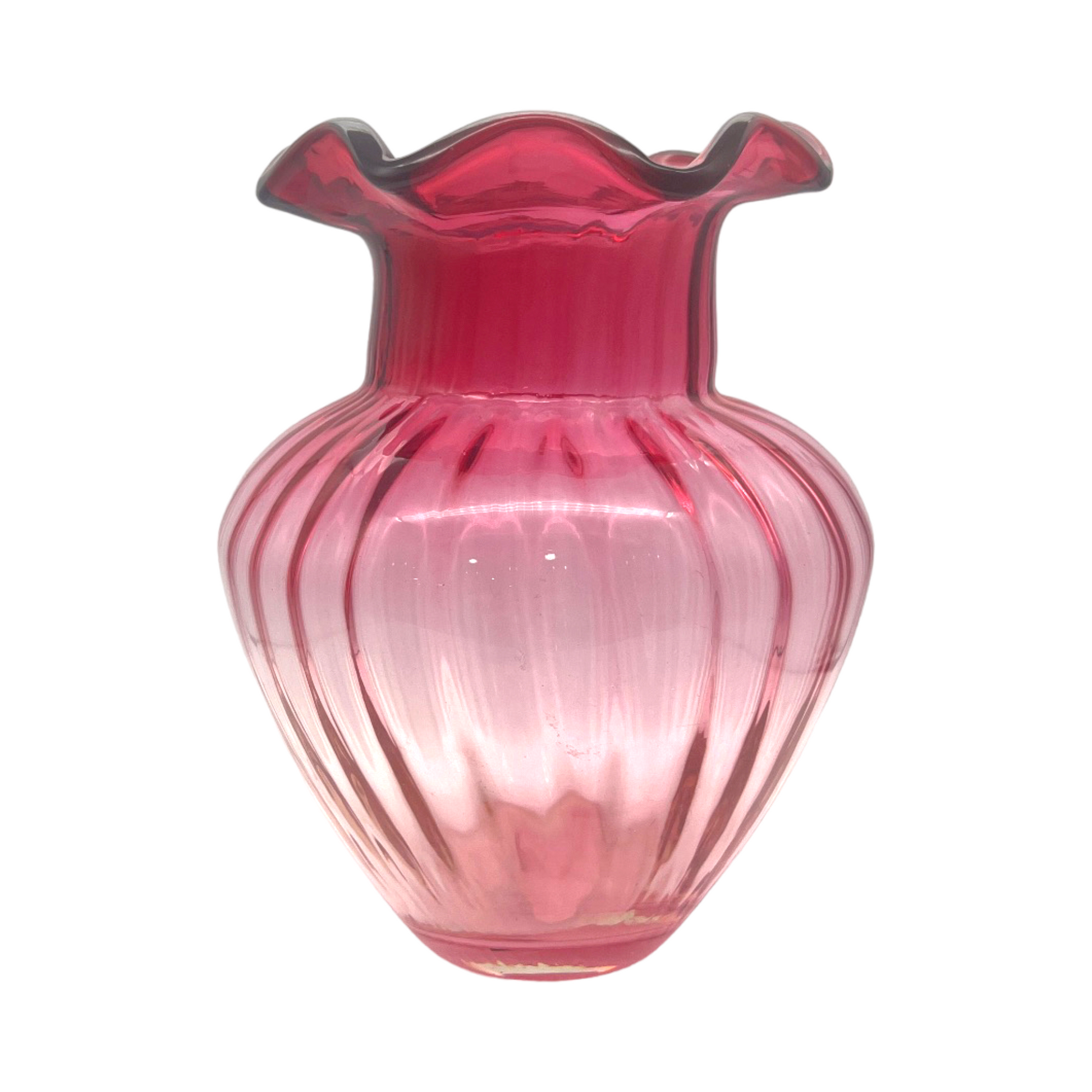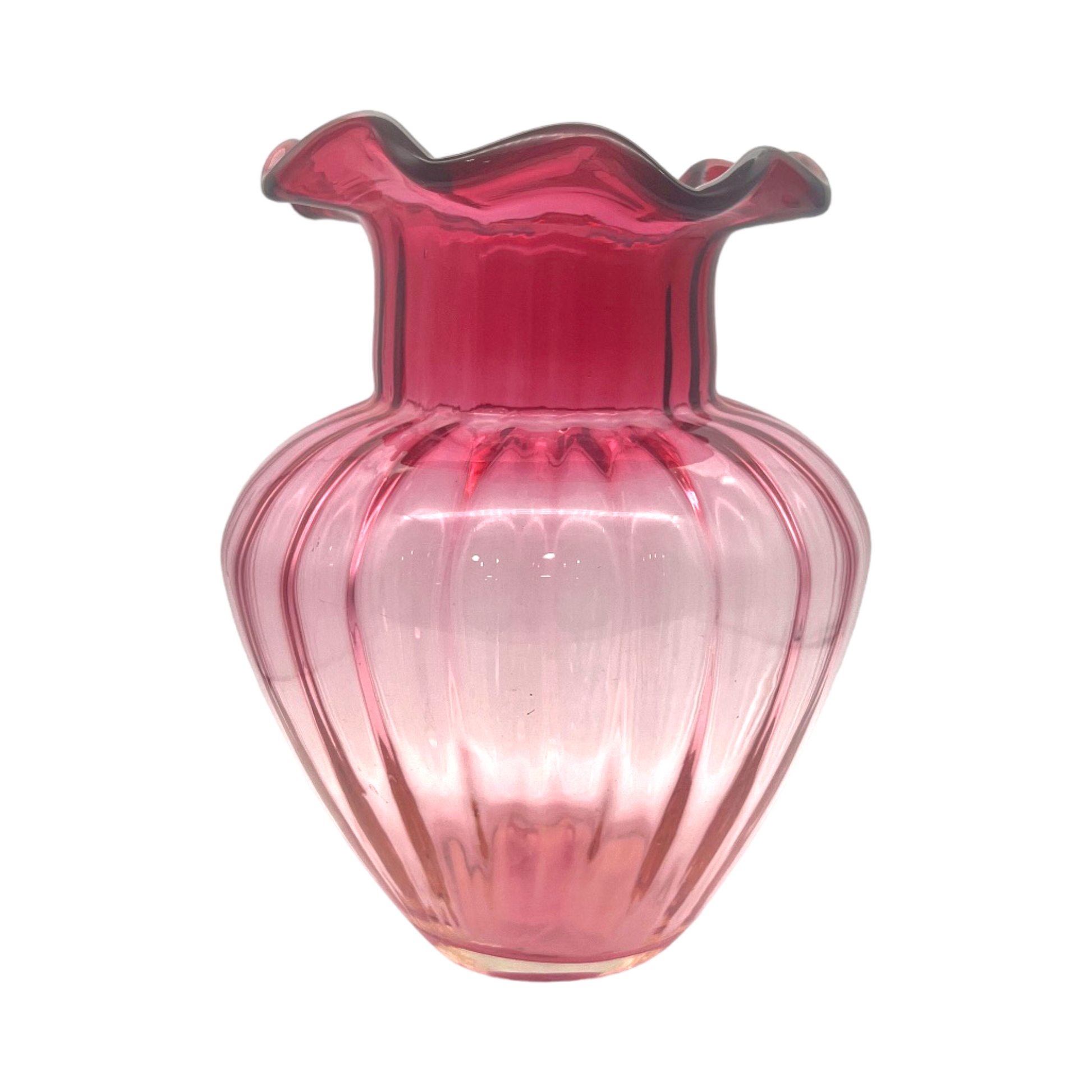 Experience the timeless beauty and craftsmanship of Pilgrim Glass with our vintage Cranberry Ruffle Edge Vase. A true statement piece for elegant décor, designed to be cherished for years to come
