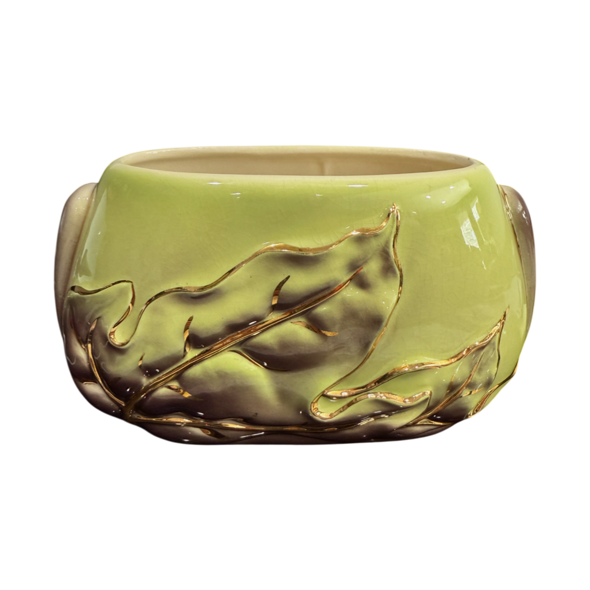The Royal Copley Oval Leaf Vase with Gold Trim is a distinguished collector’s piece, measuring 4.5 inches in height. Renowned for its exquisite craftsmanship, this extremely rare vase features a delicate oval leaf design accentuated by elegant gold trim, showcasing the artistry of mid-century American pottery. Its compact size makes it a versatile accent for any space, while its rarity adds significant value for collectors and enthusiasts. Perfect for displaying small floral arrangements or as a standalone decorative object, this vase embodies both historical significance and timeless beauty.